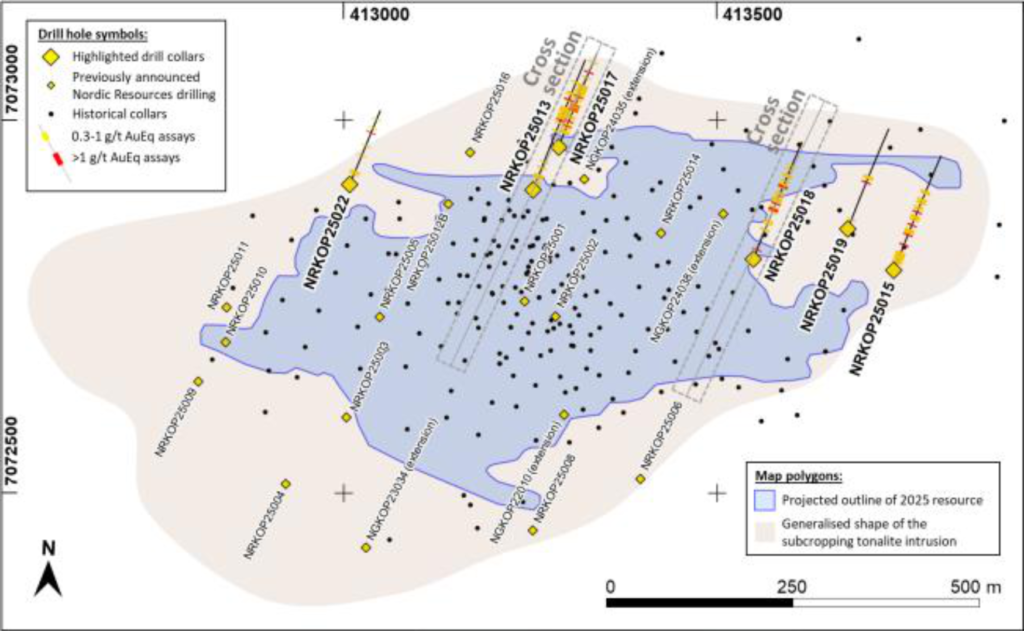 Nordic Resources Ltd’s latest drilling at the Kopsa gold-copper project in Finland has delivered new assay results that extend gold mineralisation further north beyond the current resource boundary, with significant intersections including a previously unknown higher-grade zone outside the existing model and the company planning follow-up drilling to test continuity and further expand the deposit.